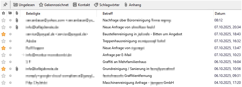 So könnte Ihr Postfach demnächst auch aussehen! Sobald wir die Erstellung bzw. Optimierung Ihrer Webseite abgeschlossen haben, besprechen wir die Implementierung etwaiger Werbemaßnahmen. In Abhängigkeit von der Rentabilität verteilen wir Ihr Marketingbudget gleichmäßig auf strategisch sinnvolle Leistungsbereiche. Sind alle offenen Fragen geklärt und das zielorientierte Vorgehen abgesteckt, programmieren wir die Werbeanzeigen in Ihrer Zielregion. Bereits unmittelbar nach Veröffentlichung der Anzeigen werden Sie die ersten Anfragen erhalten. Je länger die Werbeanzeigen geschaltet werden, desto aussagekräftigere und insbesondere bessere Daten erhalten wir. Alle zwei Wochen werden Ihre Werbeanzeigen optimiert. Nach Monatsende besprechen wir die resultierenden Erfolge gemeinsam. Anschließend setzen wir den Fokus auf die Kontaktpunkte, die sich für Sie am wirtschaftlichsten erweisen.